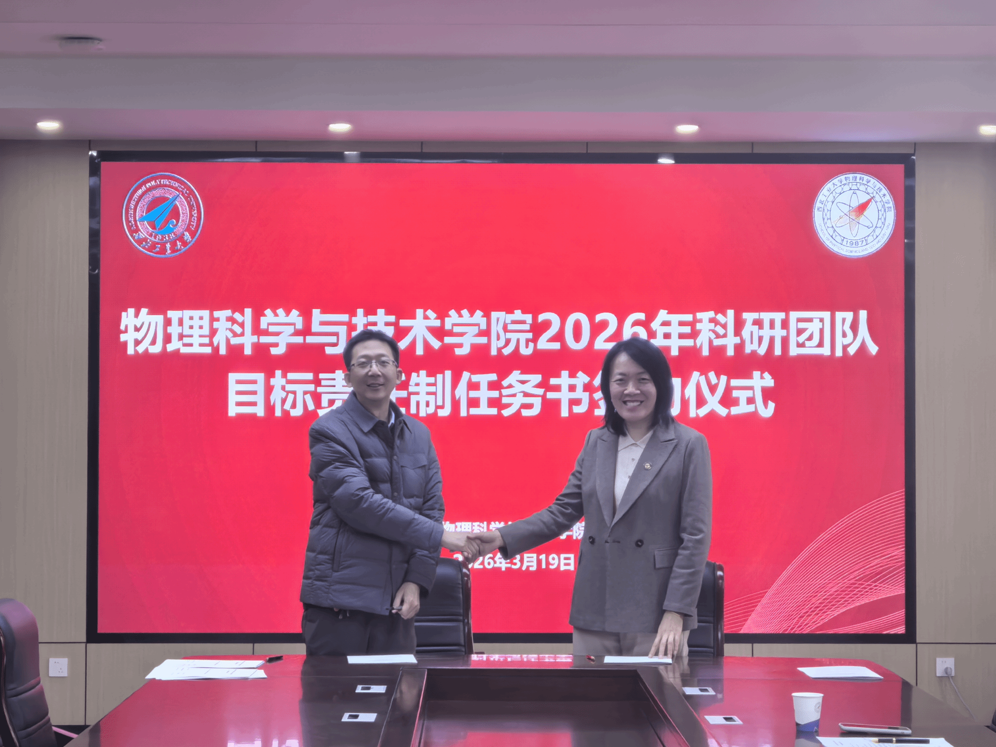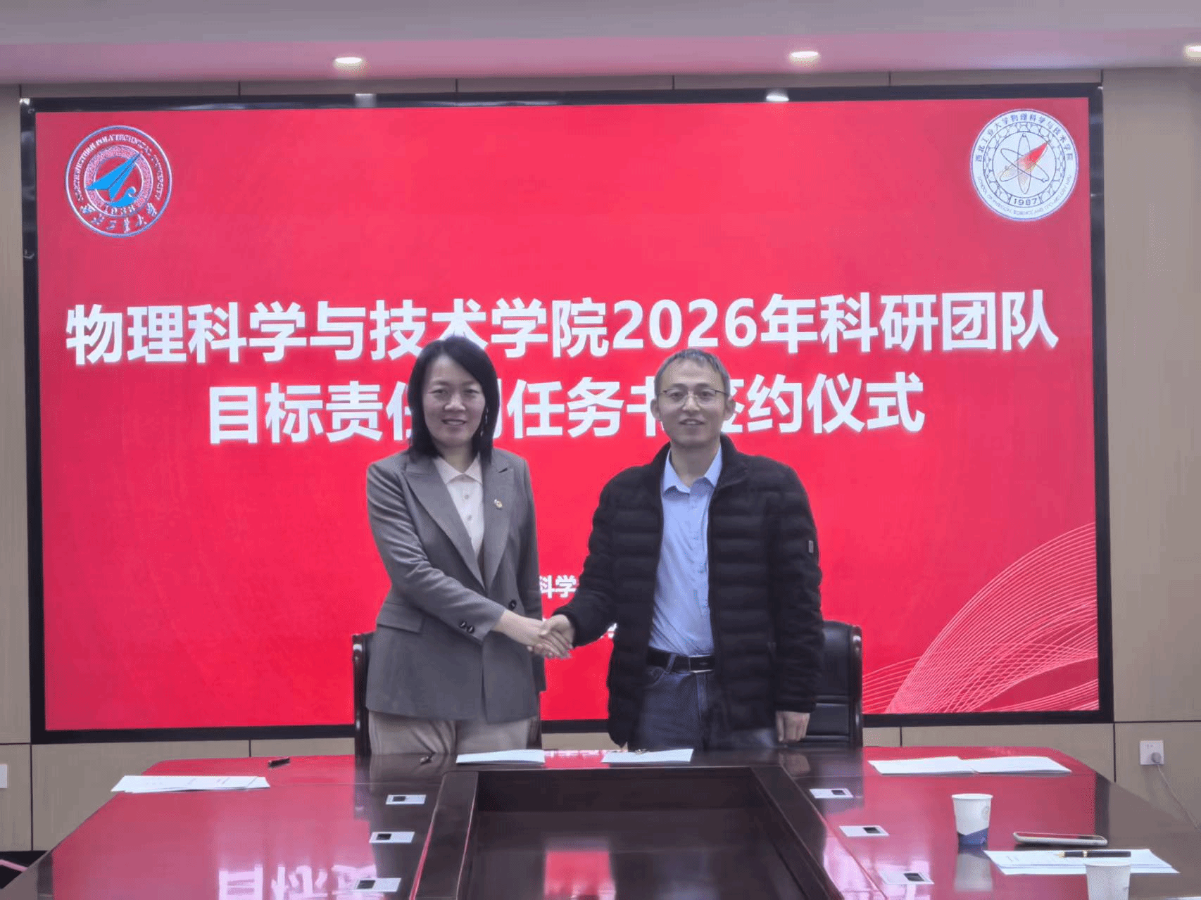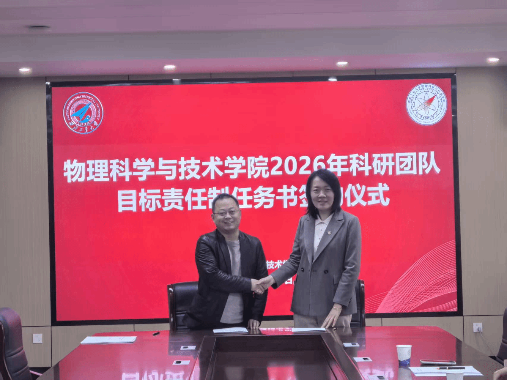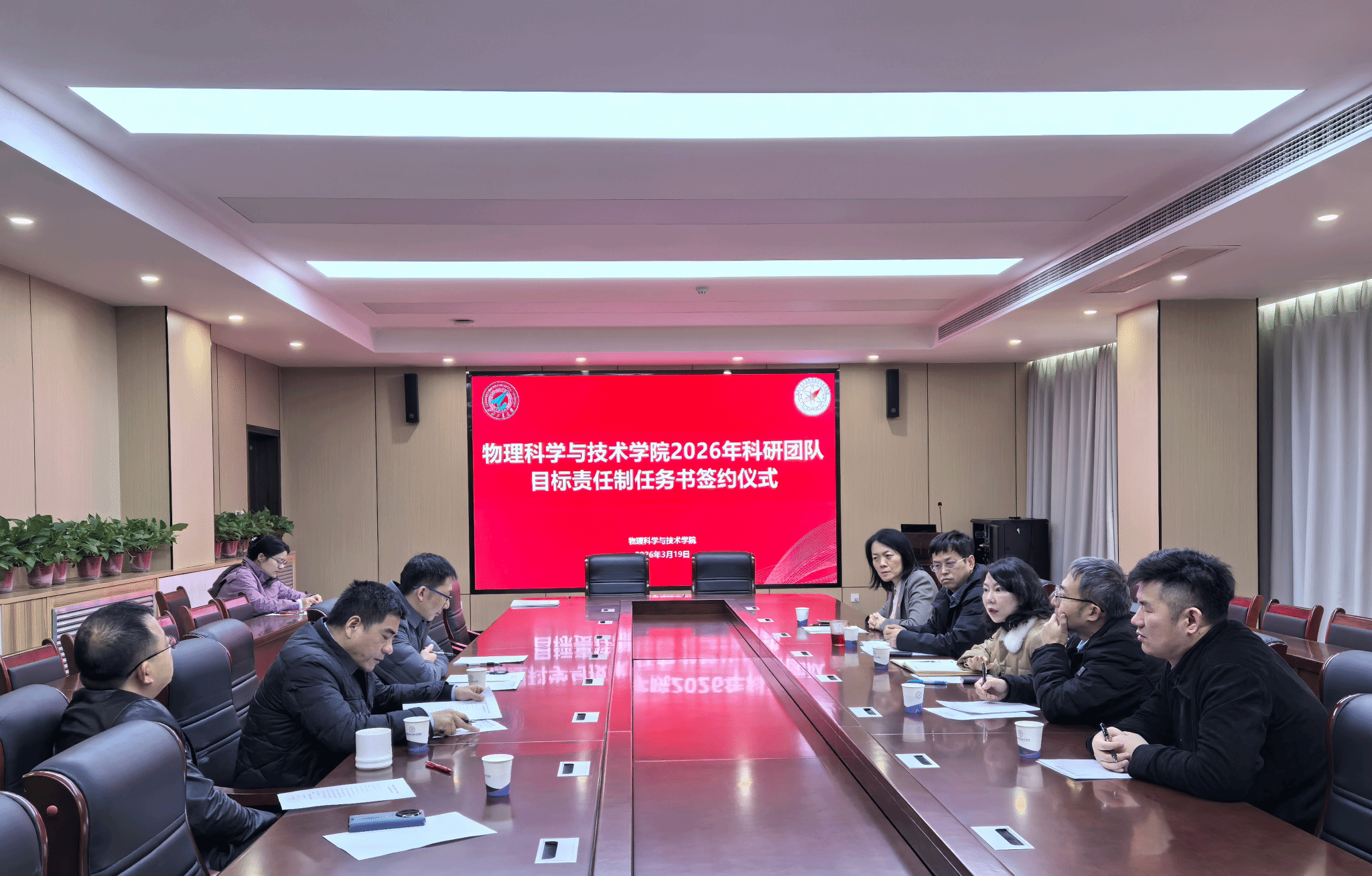 科研团队目标责任制管理办法》,对各个团队2026年度的科研和师资队伍建设任务指标进行解读,并代表在线看片分别与陕西省光信息技术团队、超声科学与技术团队和光基物质科学与超快过程团队负责人现场签订任务书。